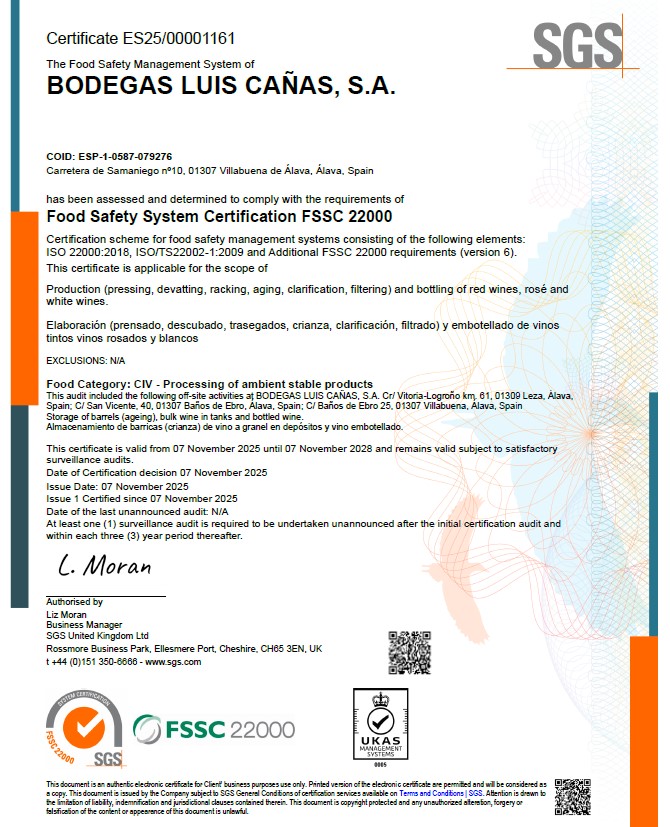 En el conjunto de la DOCa Rioja, tan solo otras dos bodegas (diez y ocho en total en España) cuentan con esta certificación, situando a Bodegas Luis Cañas en un grupo selecto comprometido con los más altos niveles de seguridad alimentaria y mejora continua.